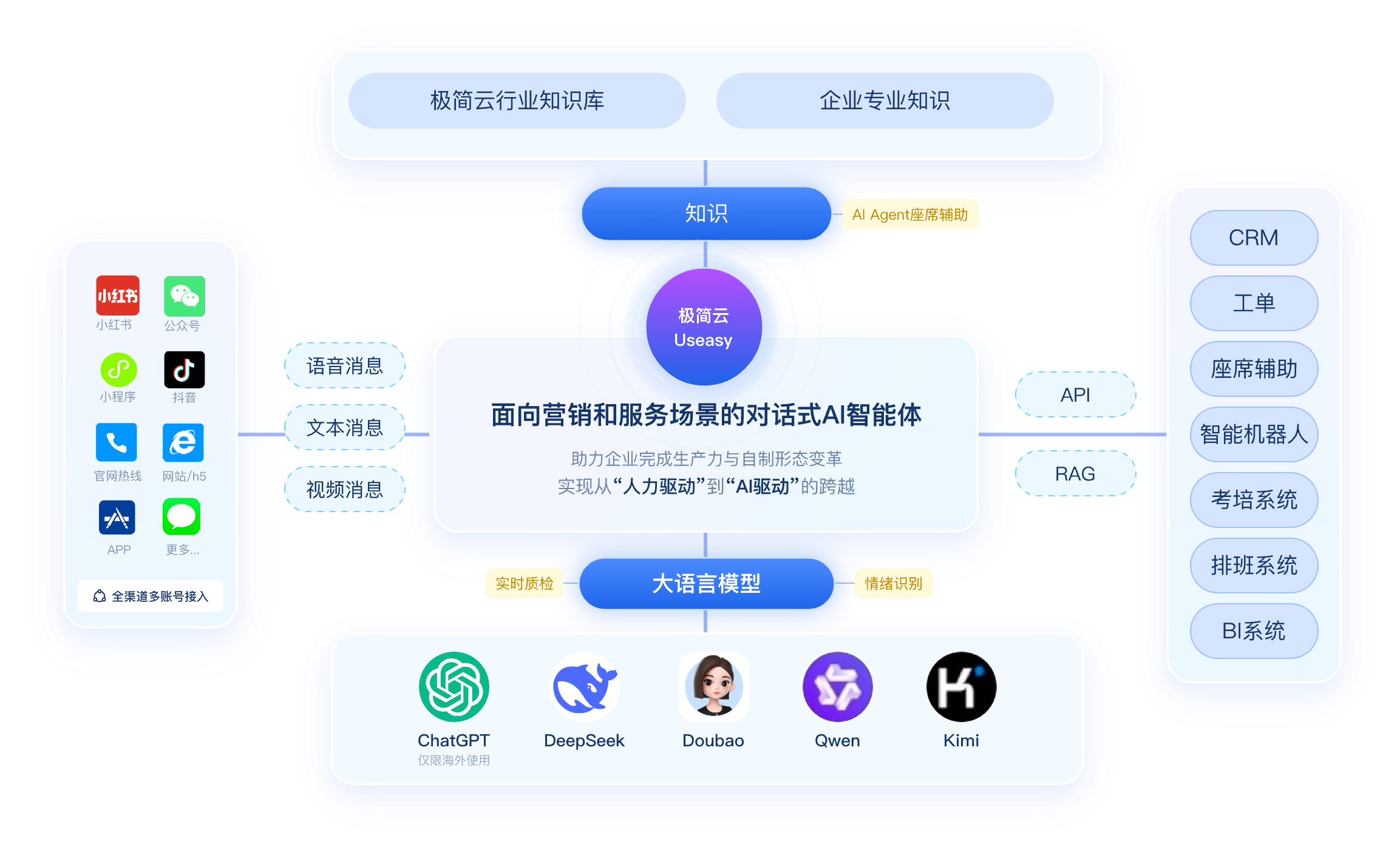 凭借自研UE智能体以及对 DeepSeek、豆包等主流大模型的深度集成,实现服务流程智能化升级,多渠道客户需求一站式响应,同时满足信创环境下的安全合规要求,助力企业在客户服务领域实现效率、体验与合规的三重突破。