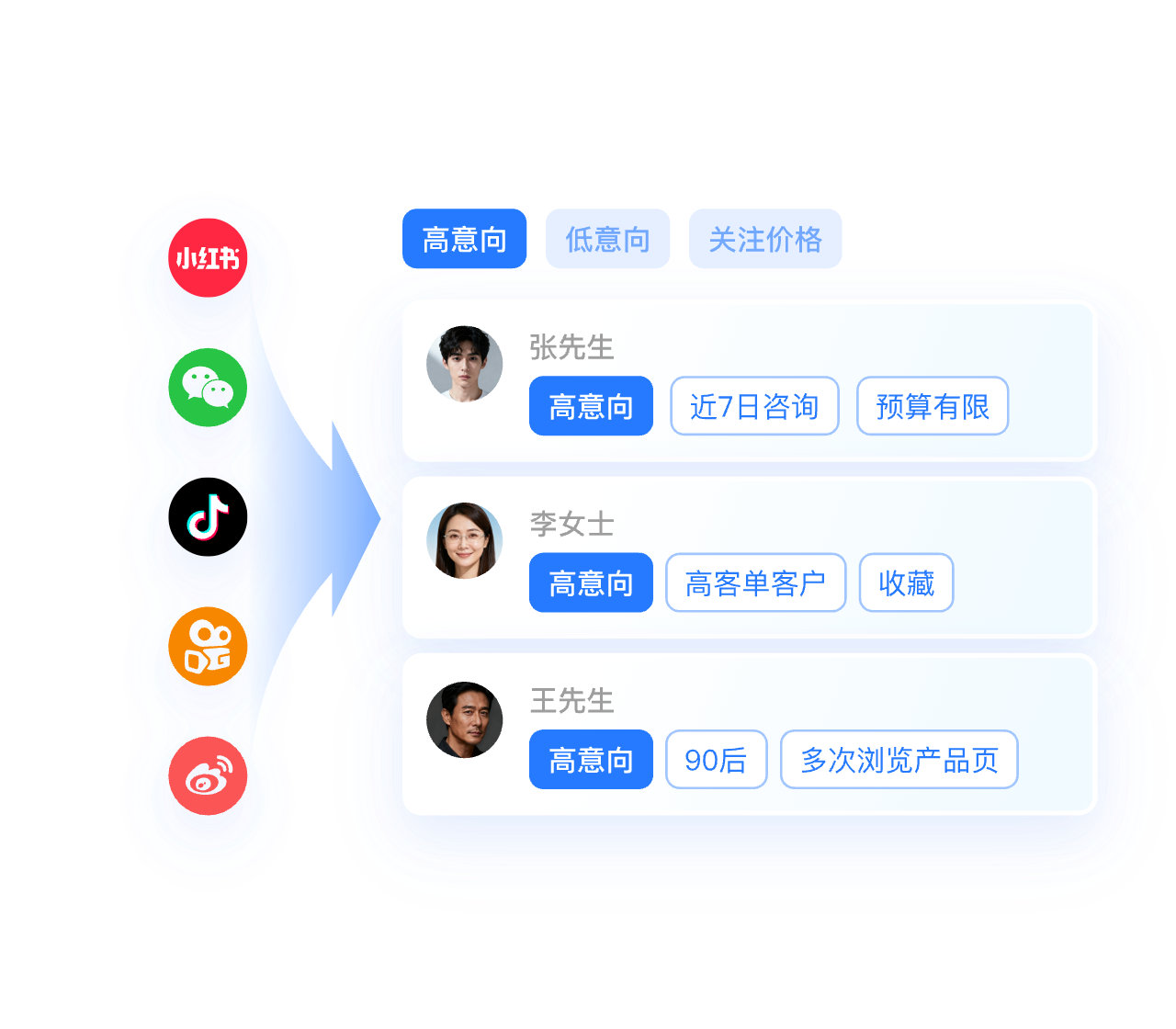 按意向度、商机阶段等维度快速筛选,高效转化