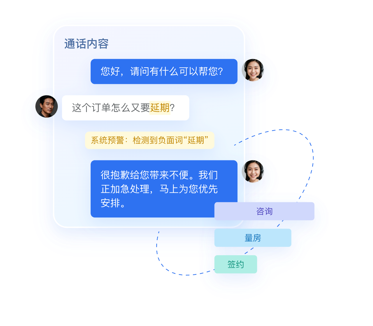 AI分析400电话/在线聊天中的负面关键词(如“延期”“加价”),实时预警并生成补救方案建议